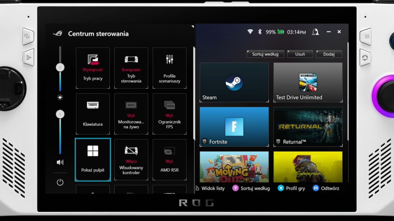 Z ważniejszych skrótów jest tutaj jeszcze opcja wyłączenia wbudowanego kontrolera. Jeśli połączycie ROGa do monitora lub telewizora i będzie mieli ochotę pograć na standardowym gamepadzie to trzeba ją włączyć przed odpaleniem gry – inaczej kontroler nie zostanie rozpoznany.