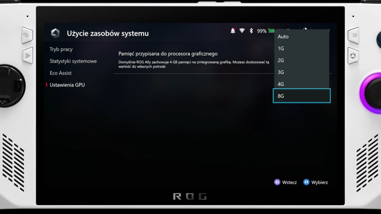 W ustawieniach dostajemy zaawansowane możliwości zmiany taktowania podzespołów, jednak jest to dedykowane tylko zaawansowanym użytkownikom, bo wiąże się z ryzykiem uszkodzenia sprzętu. Ten ROG Ally nie należy do mnie, więc nie próbowałem tu nic edytować. W zakładce ustawienia GPU znajdziemy za to możliwość zmiany alokacji pamięci dla karty graficznej – w przypadku Steam Decka sporo jest głosów, że to placebo, jednak z mojego doświadczenia potrafi to poprawić wydajność i stabilność wielu gier. Tu ogromną poprawę zauważyłem na razie w Returnalu, który na domyślnych 4GB miał bardzo duże przycinki – po zmianie na 8 ustały niemal całkowicie.