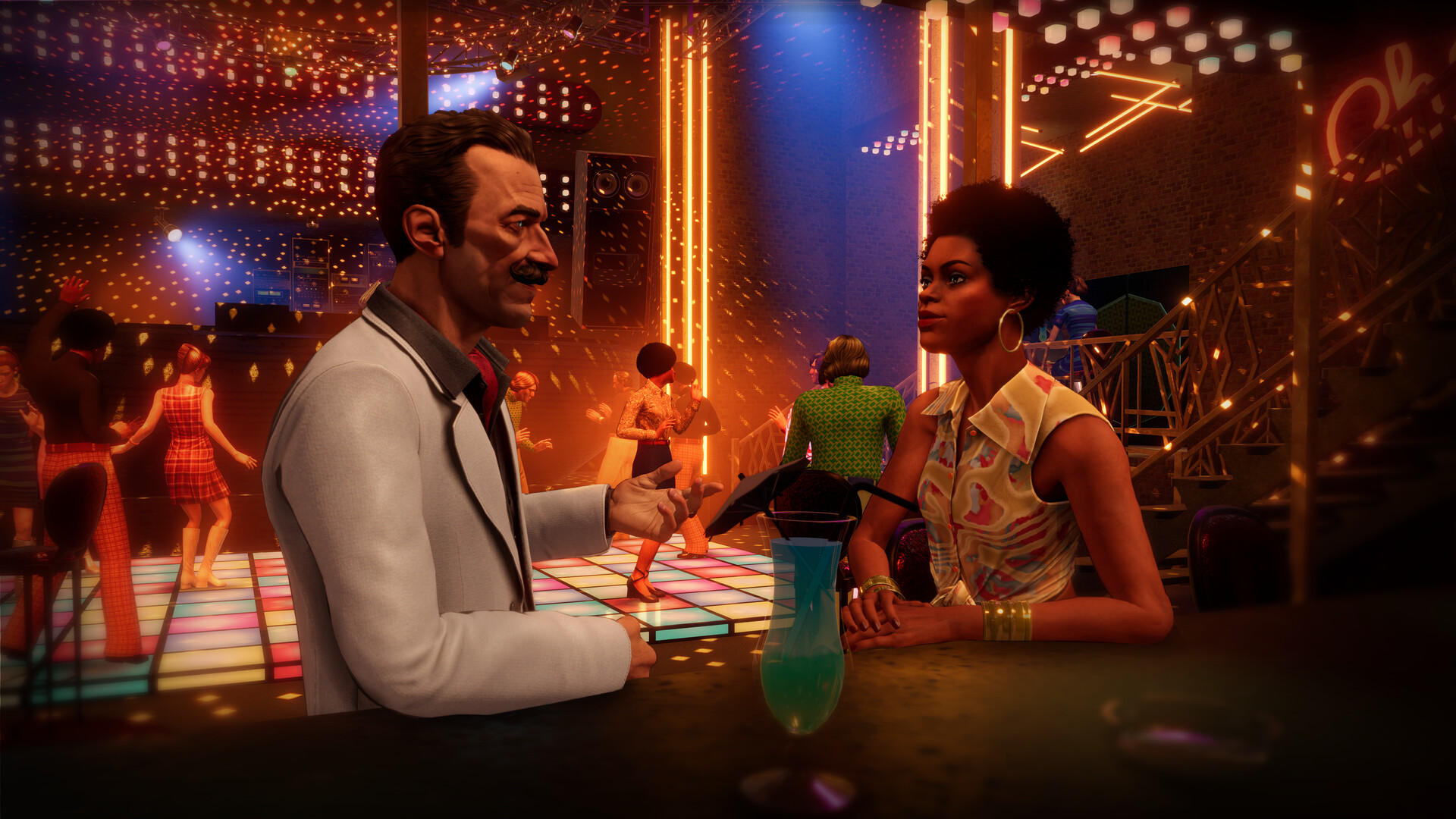 Akcja Agatha Christie: Śmierć na Nilu toczy się na tle epoki lat siedemdziesiątych, cechującej się zmianami społecznymi i kulturowymi. Twórcy całkiem ciekawie oddali klimat tamtych czasów poprzez charakterystyczne ubiory i fryzury, a także muzykę, która przygrywa w tle. Klubowa sceneria pasuje tu całkiem nieźle, ale bardziej ciekawi mnie prezentacja kolejnych etapów gry.