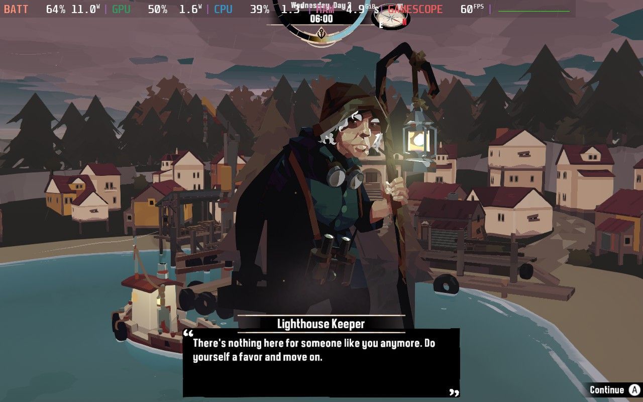 Pomiędzy pływaniem a odwiedzaniem doków sporo rozmawiamy ze spotkanymi postaciami, poznajemy ich mroczne historie i wykonujemy proste zadania. Fabularnie gra nie zachwyca, ale raczej nie takie było jej zadanie – tu główne skrzypce gra jednocześnie spokojna i niepokojąca rozgrywka. Jak złapałem już mniej więcej o co chodzi w tej grze i jak prawidłowo się rozwijać to nie mogłem oderwać się od ekranu aż do napisów końcowych.