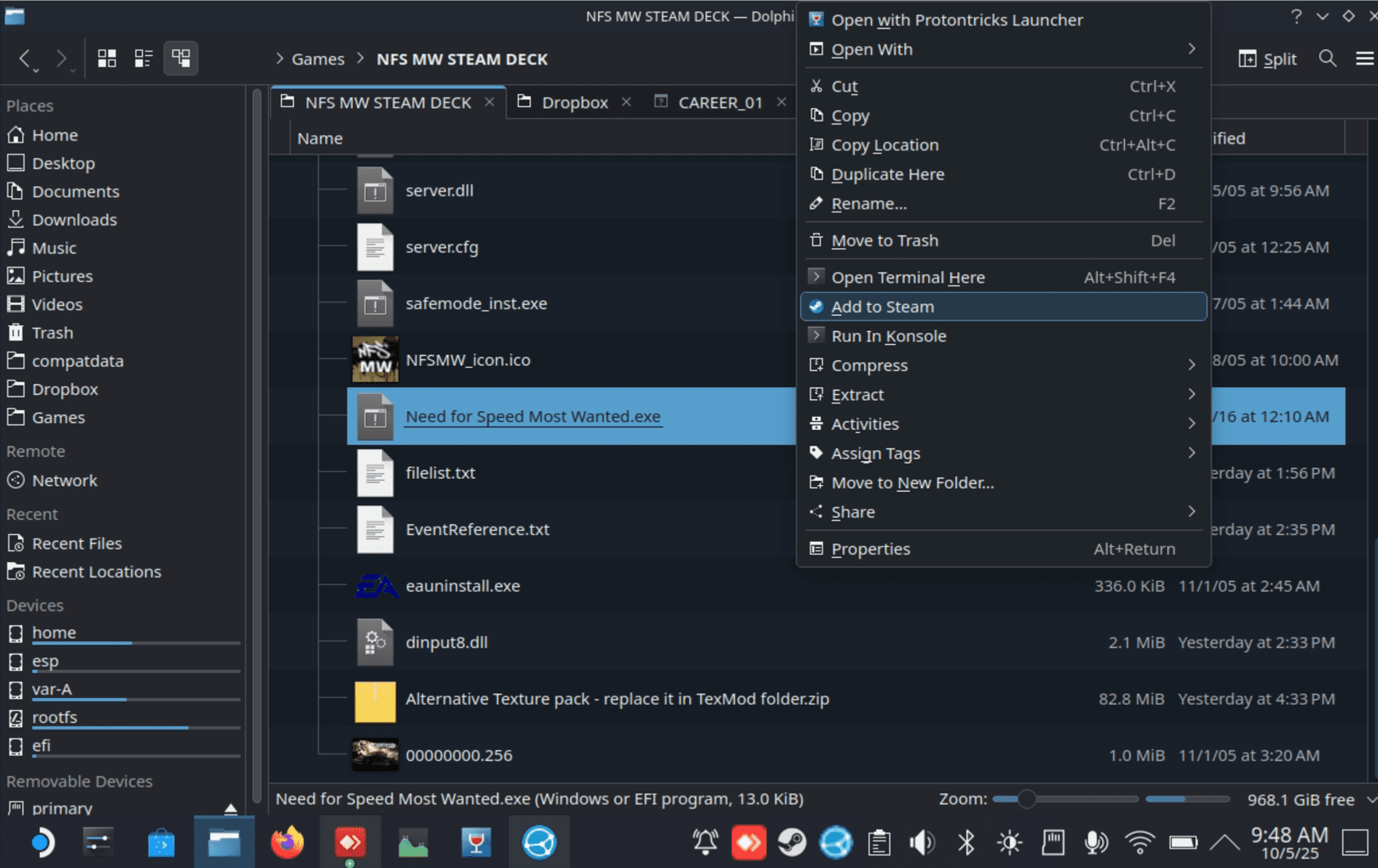 W przypadku Steam Decka, folder z zainstalowanym Need for Speed Most Wanted w wersji 1.3 i wgraną paczką modów przenieście w całości do urządzenia (za pomocą pendrive, chmury, SSH czy karty pamięci) – lokalizacja plików nie ma większego znaczenia. Cała procedura odbywa się oczywiście w trybie Desktop.