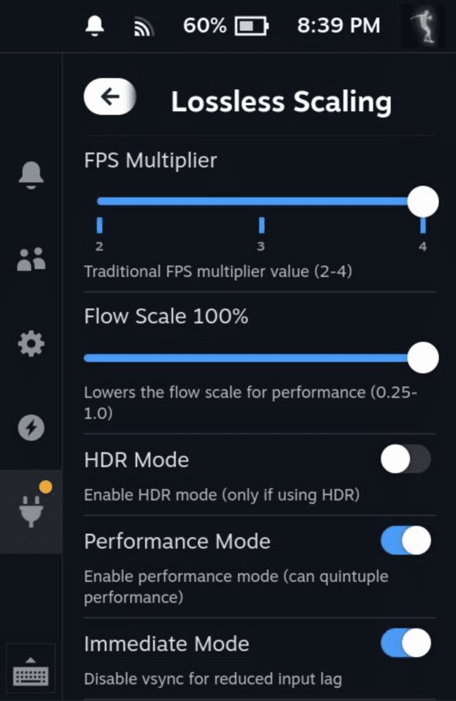 Lossless Scaling.zip, który wcześniej pobrałeś (najprawdopodobniej znajdziesz go w folderze Downloads). - Po krótkim ekranie ładowania wtyczka powinna pojawić się w bocznym menu Decky.