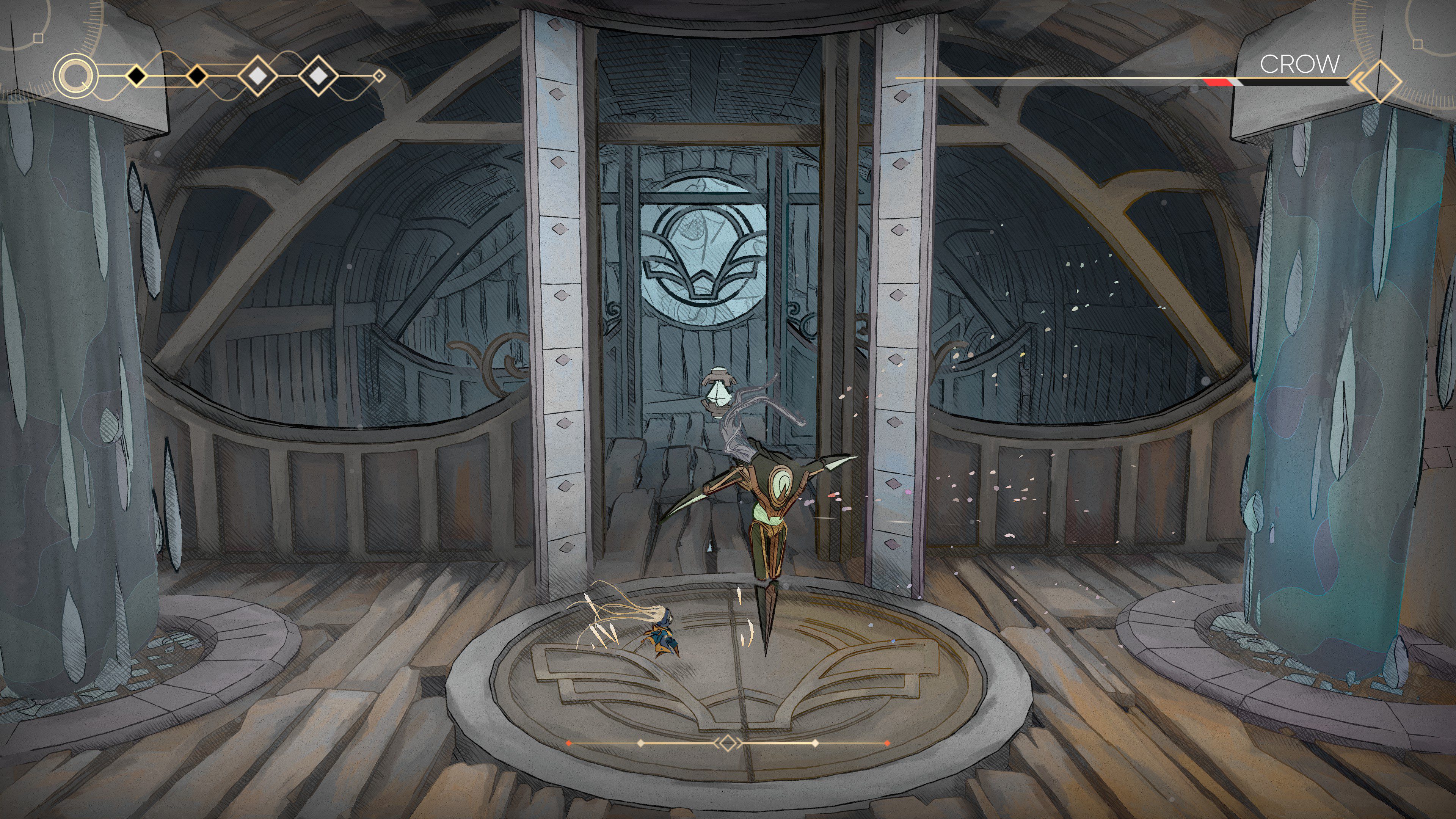 System rozwoju postaci również ma wyraźny metroidvaniowy charakter, ale z twistem. Zamiast prostego drzewka zdolności dostajemy komponenty i modyfikatory, które realnie zmieniają zachowanie umiejętności. Hak może służyć do agresywnego przyciągania się do wroga albo do błyskawicznego uniku. Możemy zainwestować w większe szanse na przeżycie poprzez aktywowanie dodatkowej tarczy, co w danym momencie np. nie pozwoli użyć silniejszego ataku.