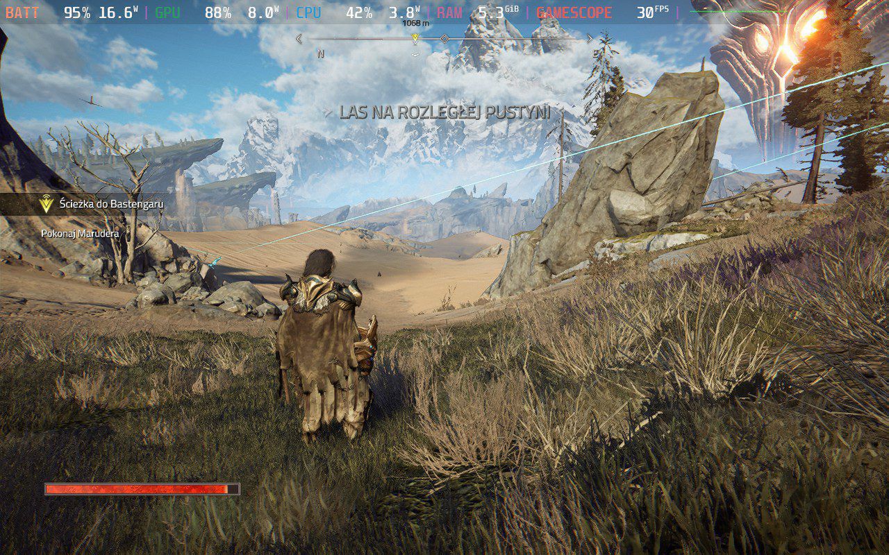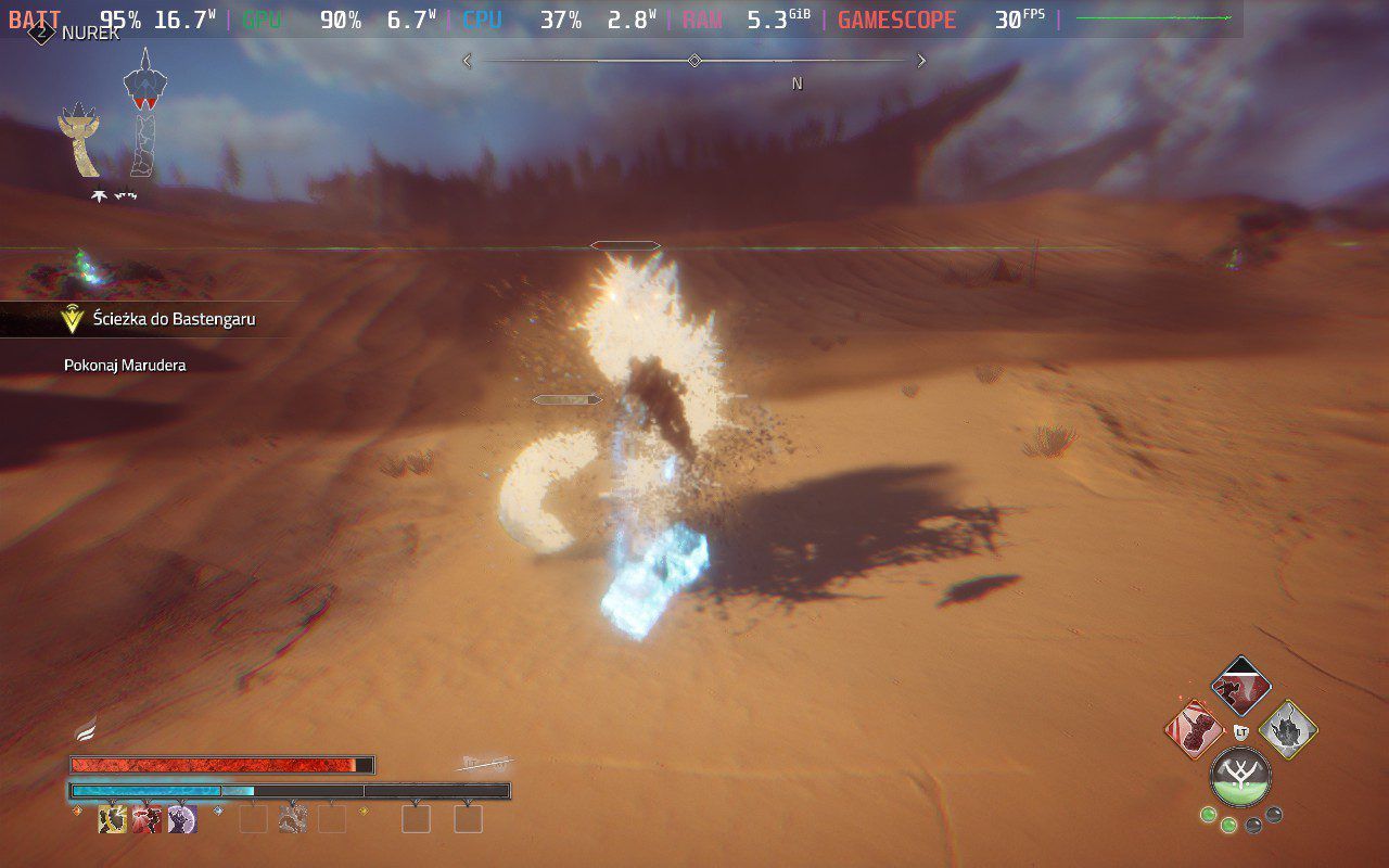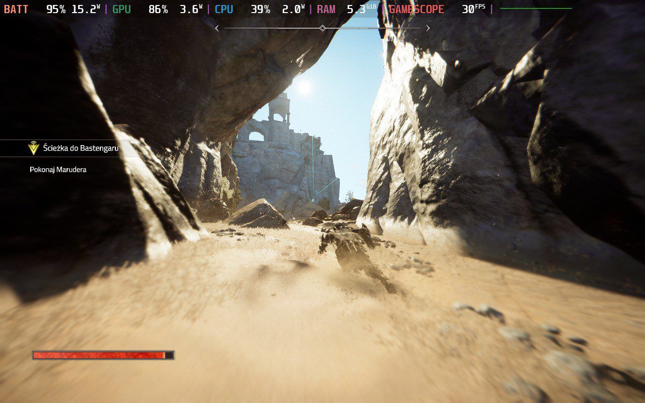 Jeśli zablokujecie liczbę klatek zgodnie z moimi radami to powinniście uzyskać około 2. godzin rozgrywki na jednym ładowaniu. Co ważne, przed włączeniem gry jesteśmy zapytani czy uruchomić Atlas Fallen, czy wybrać tryb DirectX 12 – na Steam Decku działa tylko ta pierwsza opcja i kryje się pod nią nakładka Vulkan.