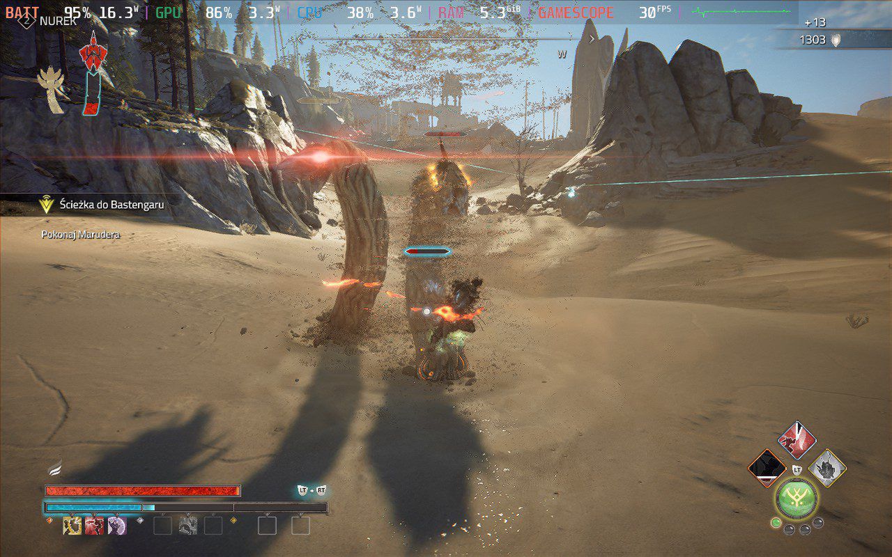 Atlas Fallen ogrywałem głównie na komputerze, ale spędziłem też kilka godzin na Steam Decku. Sprawdziłem wszystkie dostępne ustawienia i po dłuższych testach zablokowałem płynność w SteamOS na 30 klatek. W mniej zatłoczonych miejscach można celować w 40, jednak nawet po ustawieniu absolutnego minimum wydajność podczas dynamicznych starć i w miasteczku potrafi spaść poniżej 30 FPSów. Są to jednak na tyle incydentalne sytuacje, że moim zdaniem nie przekreślają tytułu na Steam Decku, zwłaszcza, że opóźnienia w sterowaniu nie są duże i nie miałem większych problemów z ubiciem trudniejszych bestii.
