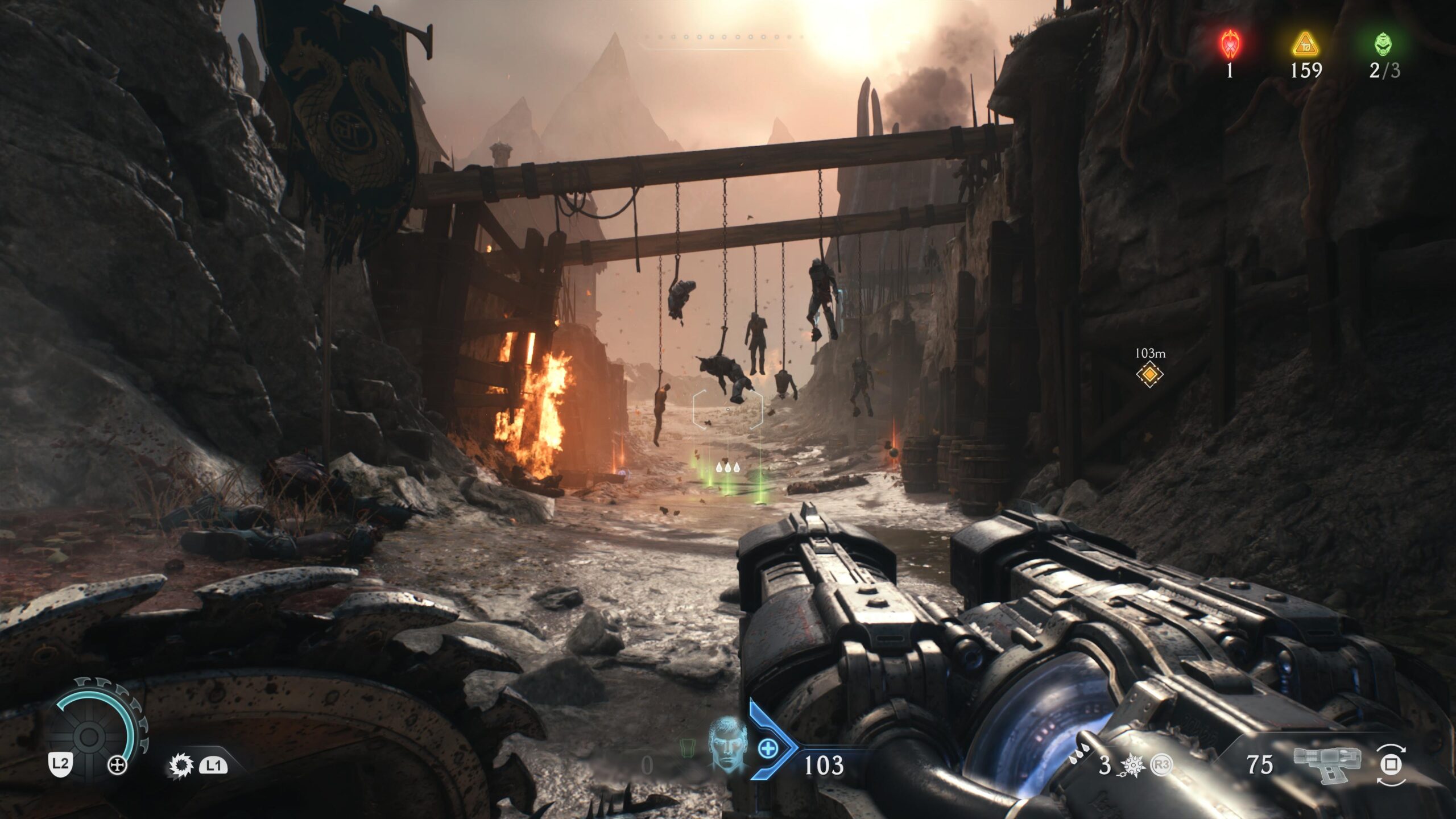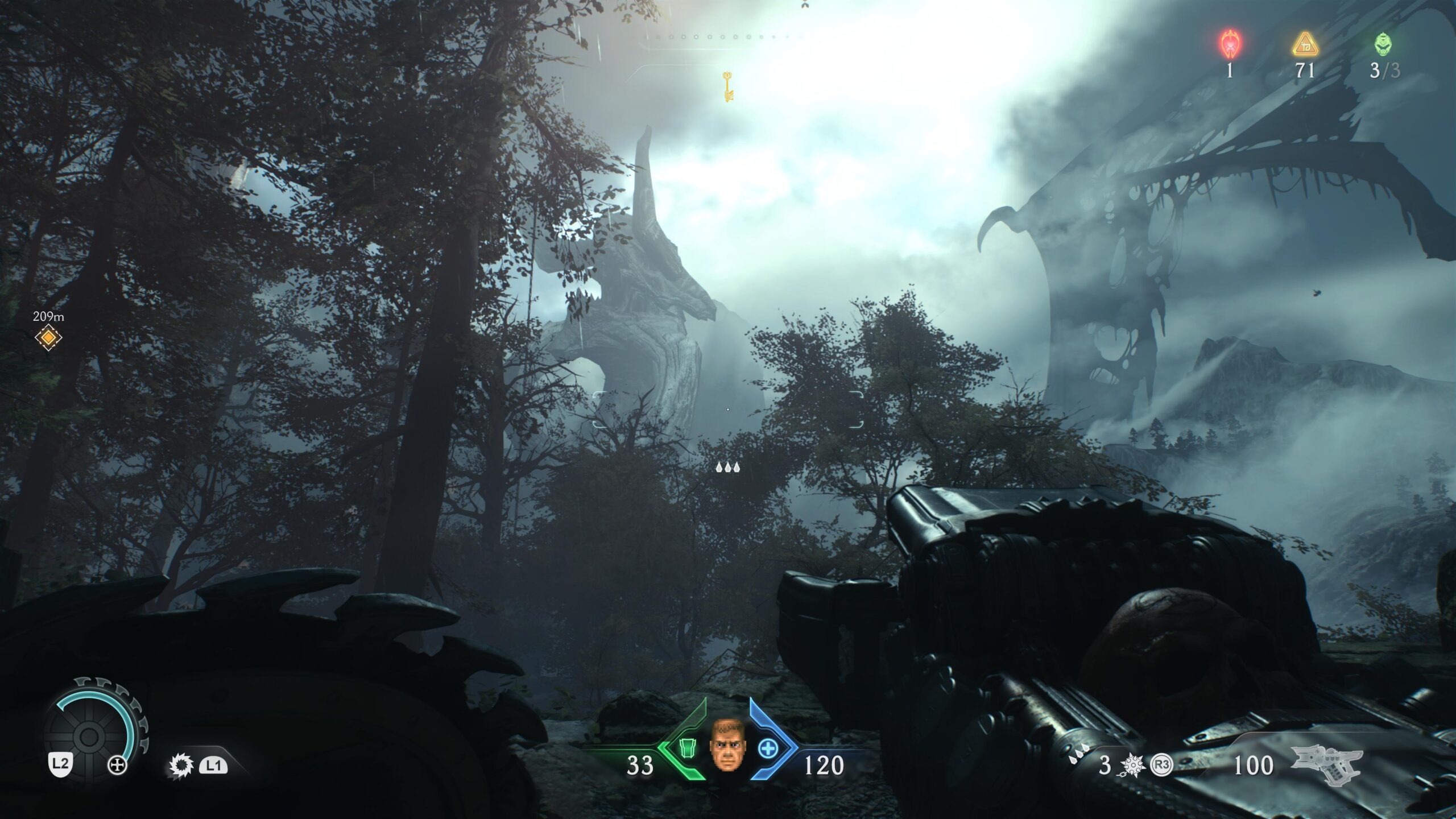 Dwa słowa o oprawie. Grałem na PS5 Pro i – jak twierdzi Digital Foundry – to najlepsza jakość spośród wersji konsolowych. Mamy 1800p, czasami dynamicznie skalowane w dół przy większej akcji na ekranie, ale przy stabilnych 60 fps. Doom: The Dark Ages wygląda bardzo dobrze, szczególnie w półotwartych lokacjach, które przemierzamy i podziwiamy widoki.