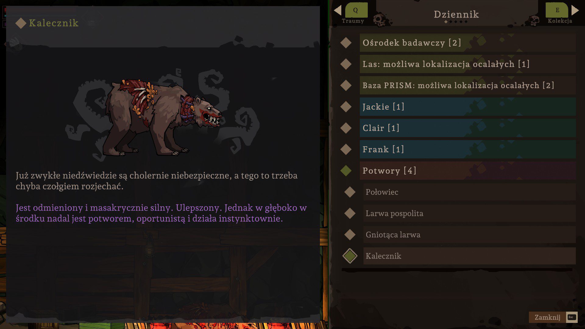Tak samo dobre jakościowo jest w mojej ocenie udźwiękowienie. Każda z postaci brzmi naturalnie, każda z nich ma swój charakter, który od razu nam pokazuje. I tak od Cartera czuć zmęczenie, Clair widać, że kocha pracę biurową, a taki Scot ma już nie pokolei w głowie. Tak samo potwory, których trochę w grze jest. Od razu rozpoznajemy z kim mamy do czynienia i jak jest jakiś ogromny to tą jego siłę widać i słychać. Wszystko to buduje gęsty klimat. I to niewątpliwie największa zaleta tej produkcji. Dorzucę jednak łyżeczkę dziegciu. Obecny build (skończyłem grę 19.09.2024) nie jest wolny od błędów, ale trzeba uczciwie przyznać, że nie przeszkadzają one w ukończeniu gry. Raz pokręcił się dubbing i miałem głos kobiecy w kwestii Cartera, raz przeleciałem przez ścianę podczas ekspedycji i musiałem zacząć od nowa, nie dostałem też jednego uczciwie zapracowanego osiągnięcia. No i to „Trudo” jako oznaczenie poziomu trudności ekspedycji. 🙂