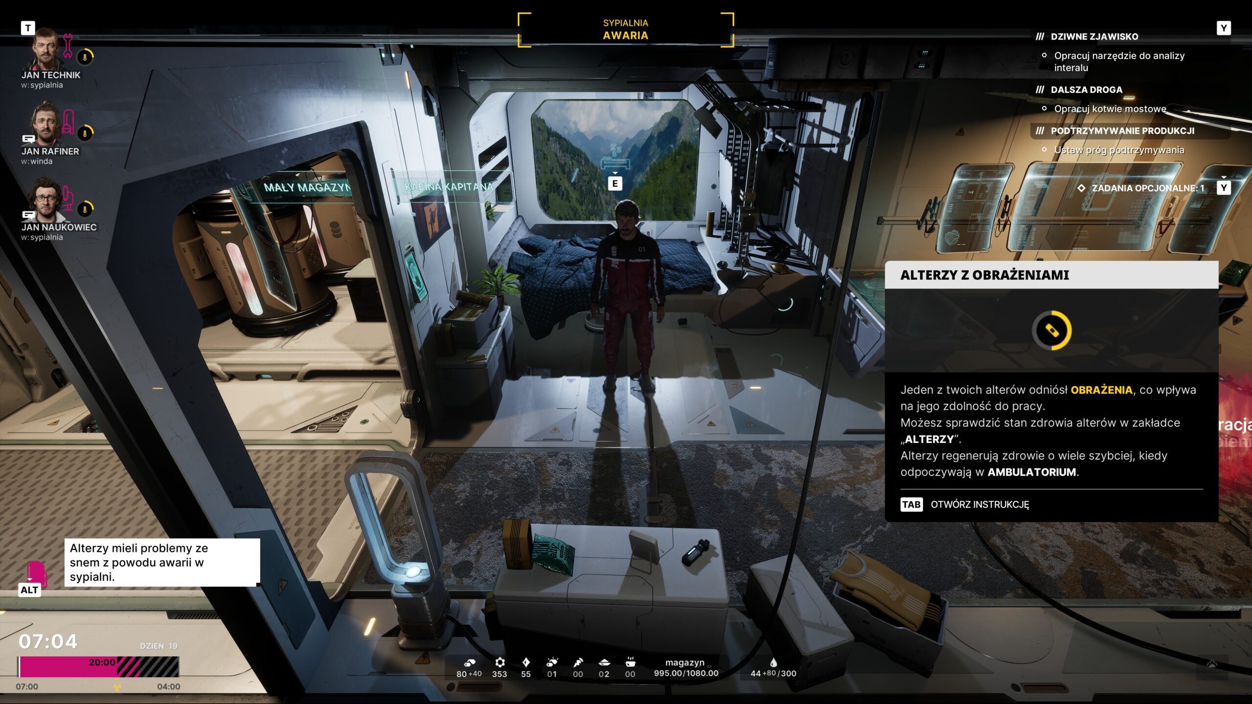 Pod względem technicznym The Alters nie jest pozbawione drobnych niedociągnięć, choć wiele problemów zostało naprawione w premierowej łatce. Pierwotnie planowałem napisać recenzję jeszcze przed wydaniem gry, ale chciałem poczekać na rozwój sytuacji, bo ostatnie godziny rozgrywki miały zaskakująco dużo błędów technicznych. Kilkukrotnie zdarzyło się, że gra zawiesiła się w kluczowych momentach, co było dość bolesne ze względu na to, że zapis postępów odbywa się jedynie podczas snu. Na szczęście dziś sytuacja wygląda zdecydowanie lepiej, choć nadal można trafić na mniejsze babole, które nie wpływają już tak mocno na zabawę.