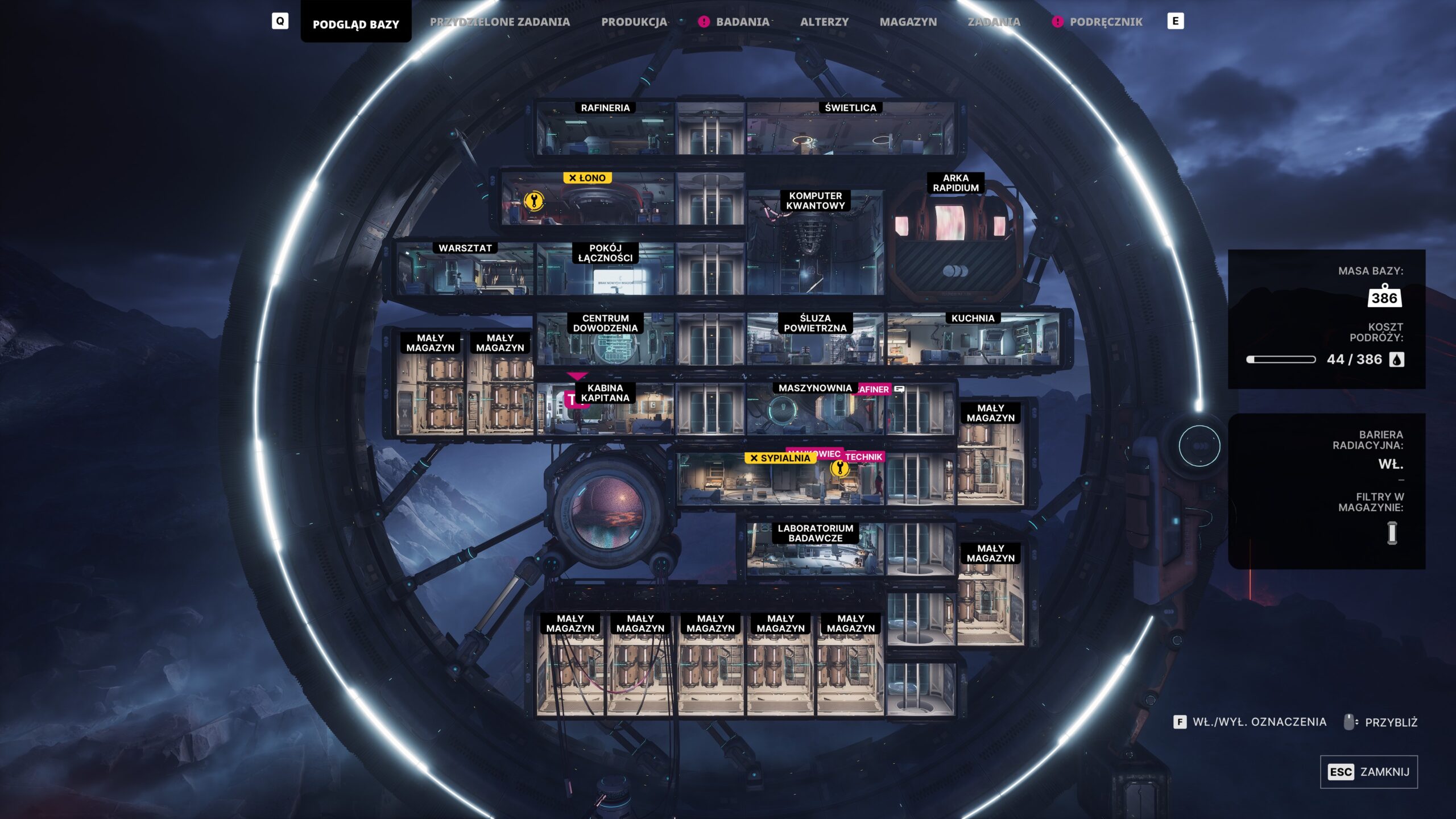 System zarządzania bazą również zasługuje na uwagę. Unikalna konstrukcja przypominająca olbrzymie koło sprawia, że przestrzeń jest dobrze zorganizowana, a jej moduły – od warsztatu, przez laboratoria, aż po strefy mieszkalne – pełnią jasno określone funkcje. Ręczne budowanie i konserwacja każdego elementu bazy wymaga stałej uwagi, choć nie jest przesadnie skomplikowane i same mechanizmy są dużo bardziej intuicyjne niż choćby w serii Frostpunk.