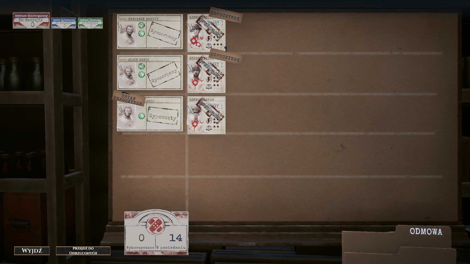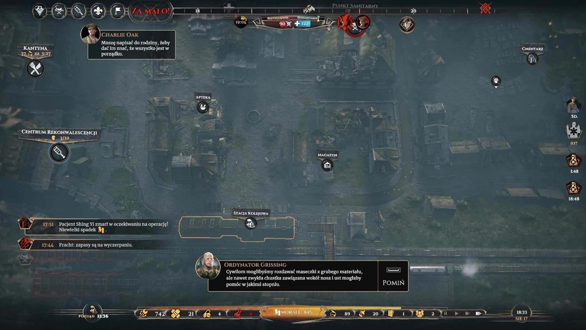 Sercem szpitala są lekarze w trzech specjalizacjach. Podstawowi, z których przedstawicielem zaczynamy, to chirurdzy. Później zatrudniamy jeszcze psychiatrów i po prostu lekarzy, którzy zajmują się najczęściej urazami po atakach gazowych. Wszyscy operują w budynku nazwanym “Oddziałem Chirurgicznym”. Tutaj zarządzamy tylko tym żeby nie padli z wycieńczenia i przydzielamy pacjentów. I może to być trochę mylące, bo pozostałym personelem wachlujemy inaczej. Nie pomaga też samouczek, który u mnie, gdy wyprzedziłem jeden z kroków się zapętlił i co chwile ukazywało się stare okienko. Wyłączyłem więc i dalej musiałem radzić sobie sam. A próg wejścia jest dość wysoki bo poza wspomnianymi lekarzami rozdzielamy zadania jeszcze zespołowi medycznemu, pielęgniarkom i inżynierom. Żeby tego było mało, każdy z nich może być przydzielony do kilku różnych budynków, mając na nie niebagatelny wpływ. I tak zespoły medyczne noszą rannych z punktu sanitarnego do lekarzy (lub na cmentarz, jeśli ci nie dotrwają do operacji), by potem przenieść ich do centrum rekonwalescencji, chowają oni też zmarłych.