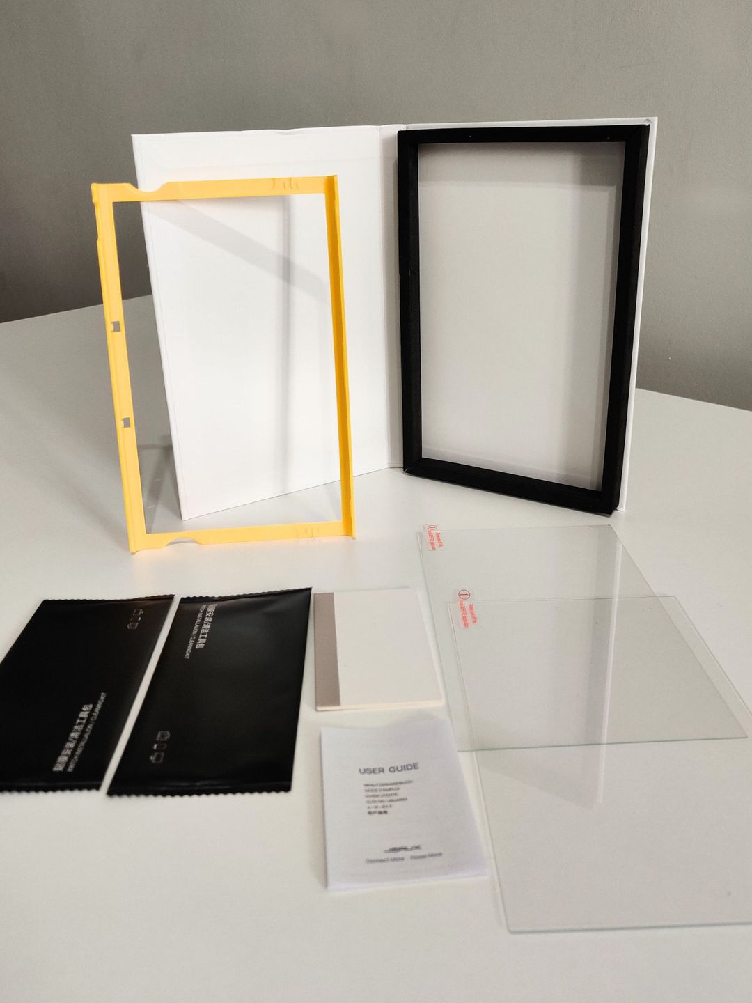 – dwie nawilżone oraz dwie suche ściereczki do wyczyszczenia ekranu wraz z samoprzylepnymi kartami do pozbycia się ostatnich paproszków