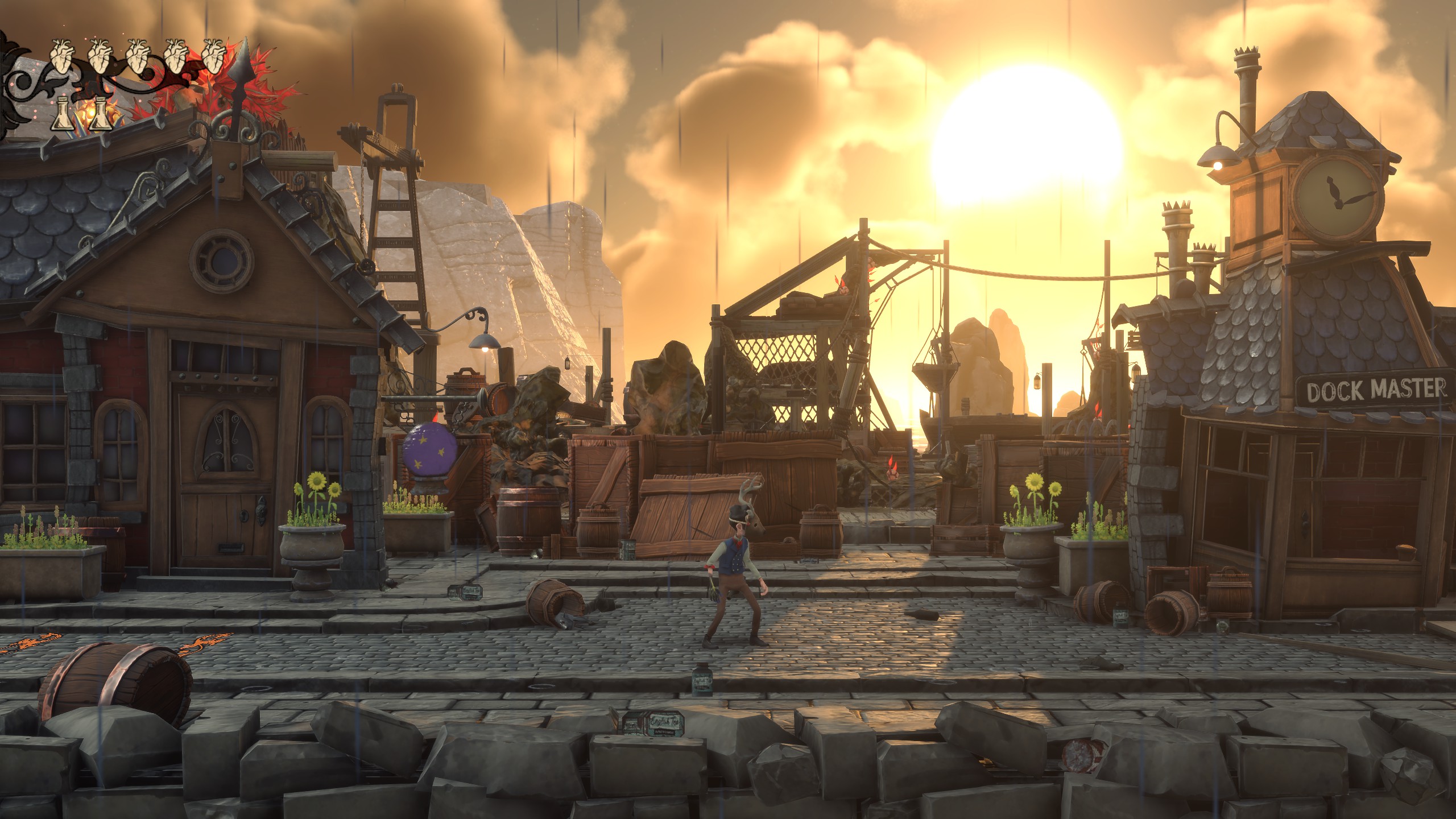 Zacznijmy od aspektów wizualnych. Moje pierwsze uruchomienie Venture to the Vile było miłym zaskoczeniem. Oprawa graficzna cieszy oko i pozwala wczuć się w klimat gry. Świat, w którym nasza główna postać “Jelonek”, czyli chłopiec z maską jelenia, przemierza lokacje pełne niebezpieczeństw, to ciekawe doświadczenie. Mamy tła 3D z elementami interaktywnych platform. Można powiedzieć, że niektóre elementy są wypukłe. Jest to coś w rodzaju wystających platform, które widzimy z innej perspektywy. Podobny zabieg jest w grze Herkules na PlayStation z lat 90’. Tam także mieliśmy rozgrywkę 2,5D. Pewne wypukłe platformy, na które Herkules mógł wskakiwać.