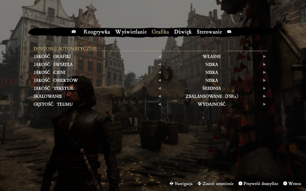 Między poszczególnymi detalami nie ma ogromnych różnic wizualnych, a najbardziej rzuca się w oczy mocno ograniczona gęstość tłumów. Ustawienie ma dość duży wpływ na wydajność gry, a po zejściu do minimum ulice są bardzo puste. Skalowanie AMD FSR 2 w trybie zrównoważonym prezentuje bardzo akceptowalną ostrość obrazu na małym ekranie i nie odbiega znacząco od natywnej rozdzielczości.