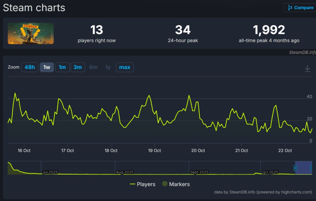 O „sukcesie” FBC nic nie świadczy lepiej niż aktualne zainteresowanie grą na platformie Steam. Warto dodać, ze w ostatnich tygodniach twórcy opublikowali sporą aktualizację, co nie spowodowało większej ekscytacji. W momencie pisania tej wiadomości możemy potwierdzić, ze FBC Firebreak ogrywa 13 osób na największej platformie dostępnej na PC, a dobowy rekord to jedynie 34. graczy jednocześnie. Myślę, że możemy już odliczać czas do wyłączenia serwerów.