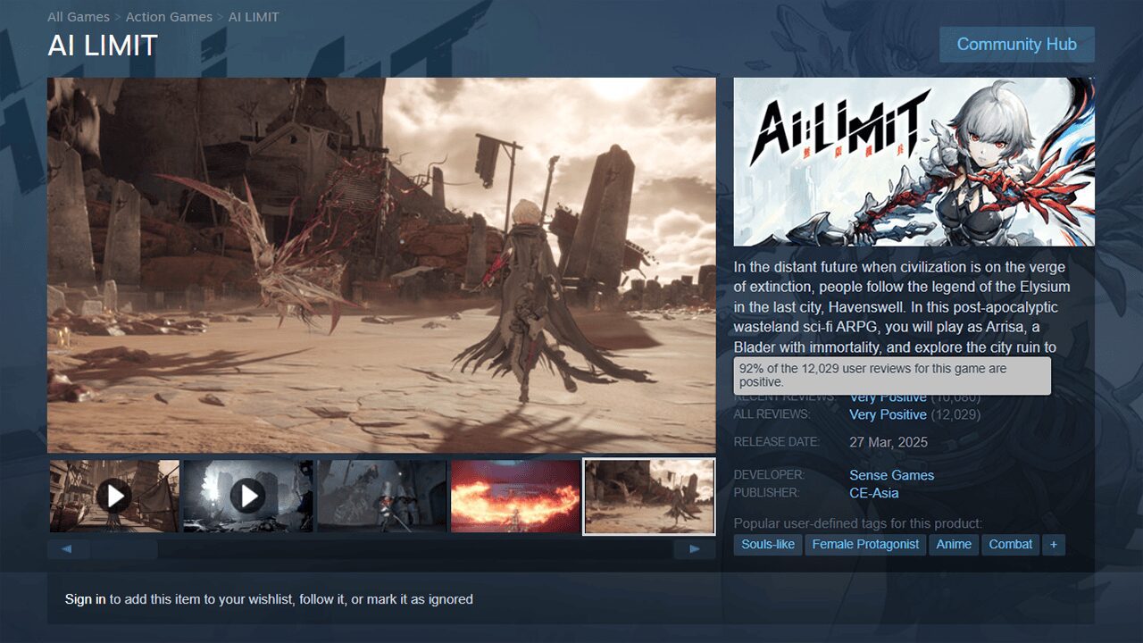 AI LIMIT to gra akcji z elementami RPG, osadzona w futurystycznym świecie po globalnej katastrofie. Fabuła koncentruje się na losach Arrisy – postaci obdarzonej nieśmiertelnością, która przemierza zniszczone terytoria w poszukiwaniu zasobów, artefaktów oraz nadziei na przyszłość.
